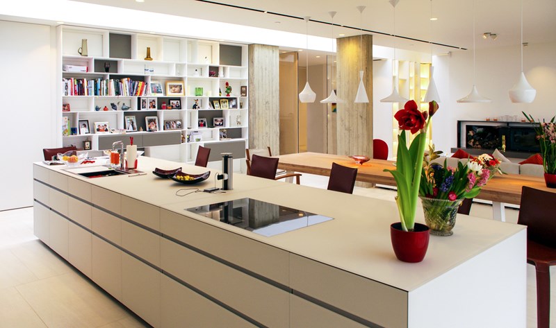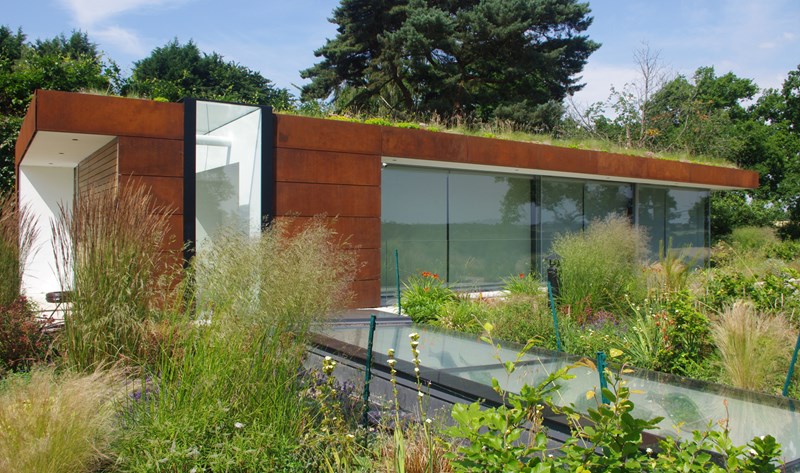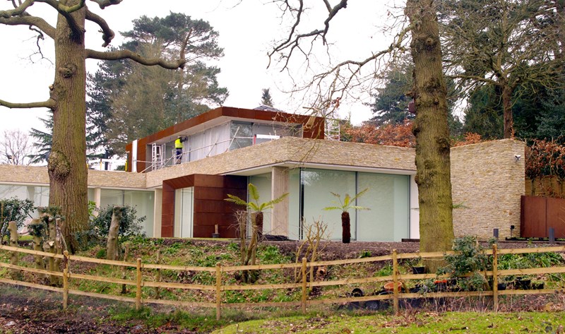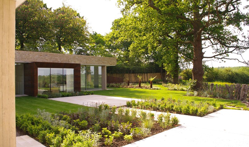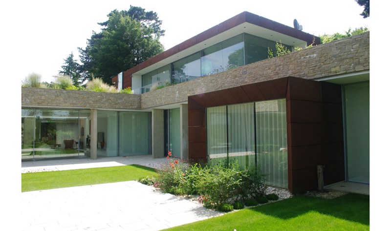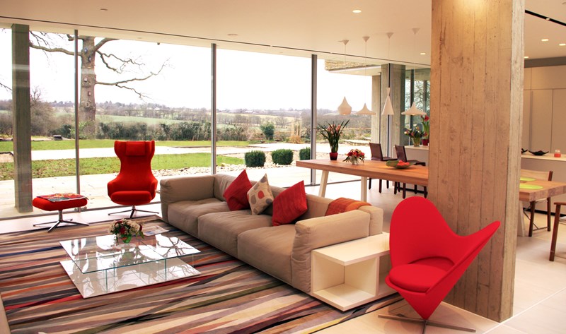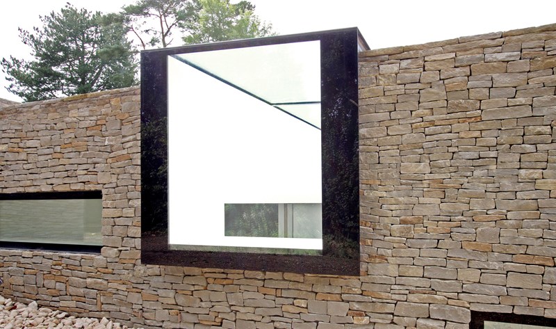 Externally, luxurious natural materials satisfy the contemporary desire for richness. Walls are faced in random Cotswold dry stone walling, with features in corten oxidised steel and fumed oak. An extensive 3m high sliding glass wall is continuous across all principal rooms, facing the views over open Crown Estate countryside beyond. The effect is that the house interior and garden are as one, fully integrated with the natural landscape. Internally, the minimalist concept is tempered with the contrasting textures of stone and wood flooring, natural board-marked concrete, sleek glass kitchen units, quirky pendant lights and built-in storage units with integrated LED lighting. Warm colours are introduced with contemporary Italian furniture.