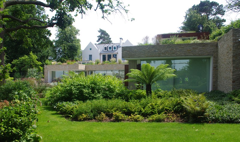 This house sits below a flat roof garden, which is flush with the ground floor level garden of the original house being replaced to our design as Camlet Way 1. This solution significantly reduces the impression of an overcrowded site prevalent in most back garden developments.