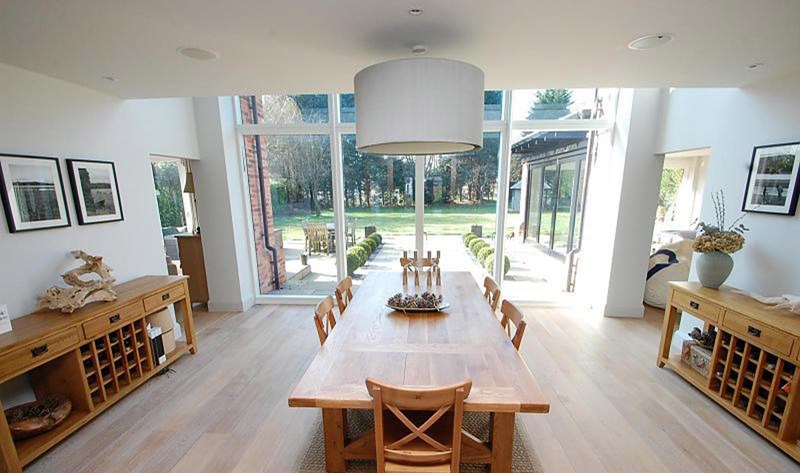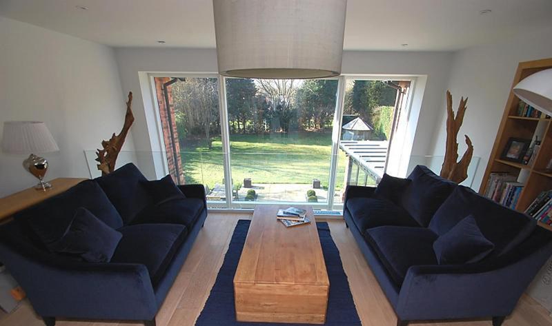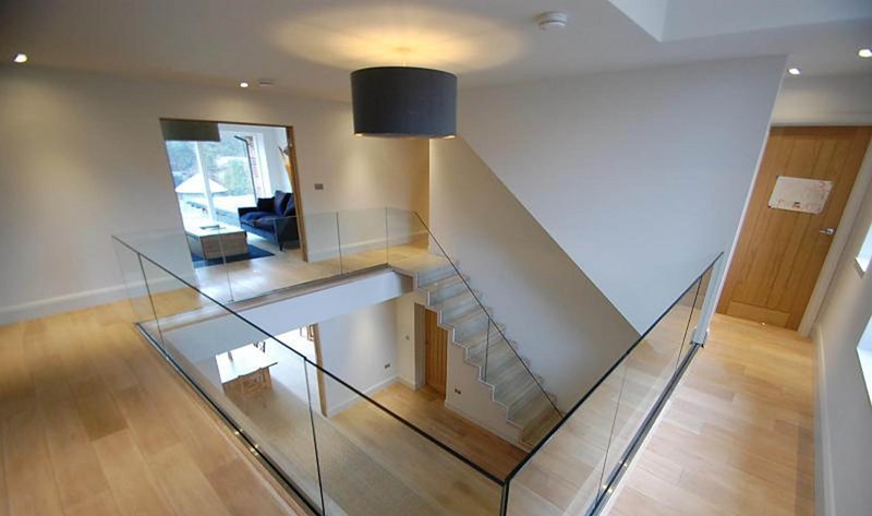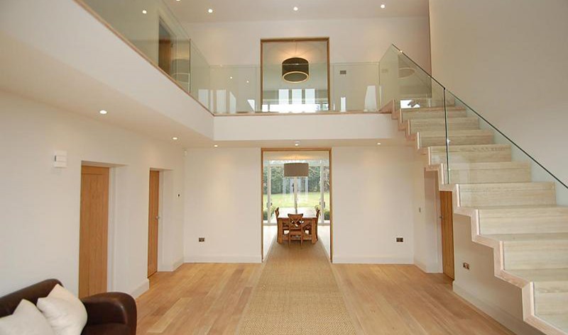Among many other changes, a double height window and first floor gallery lounge / library were added to view the south facing garden. The entrance hall and stair were remodelled to provide a vista from the front door through to the garden, with a contemporary cantilever stair and balcony with glass balustrade.