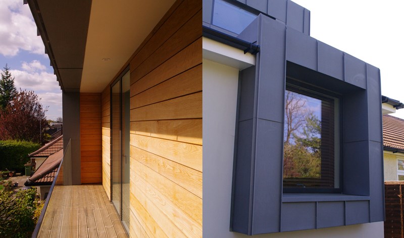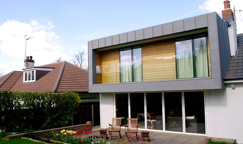 A compact extension to a 1930's bungalow in Ashtead, Surrey, completely transforming it from dowdy to "wow". A significant town planning victory, the strong but balanced asymmetrical composition of three new zinc-clad elements persuaded the planners to go against their local policy and allow a non-like-for-like extension with what is, effectively, a normally forbidden box dormer.
