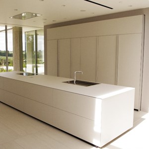 The Italian Valcucine kitchen is installed. All glass including the worktop. The tall doors tuck into the sides of the appliances, with a much better detail than Poggenpohl or Bulthaup. The island is …