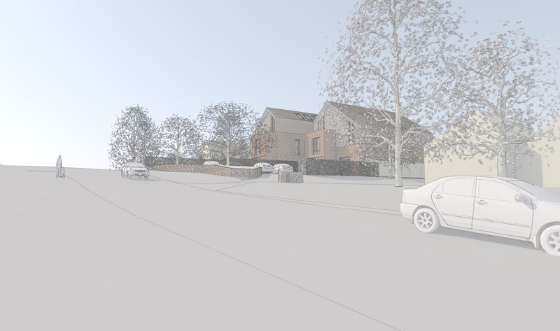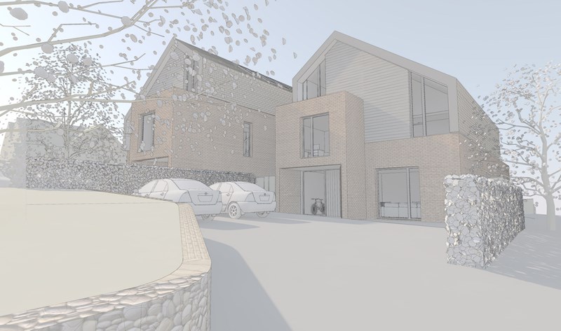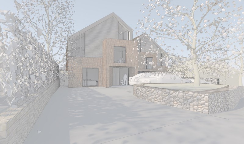 Designs for twin houses, to replace one previously existing, on a sloping site in Laughton, Essex. Submitted for Planning Permission with Epping Forest DC.