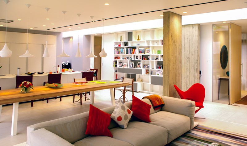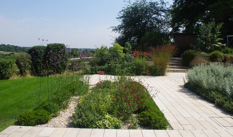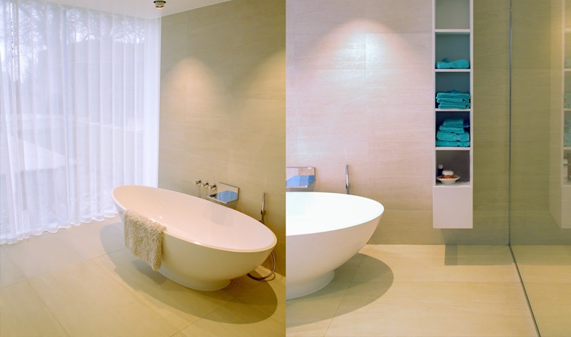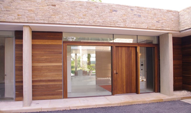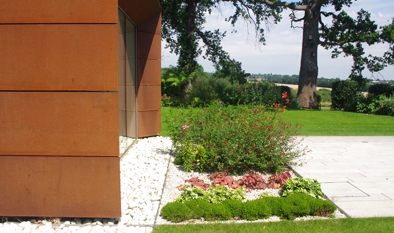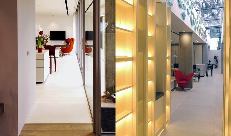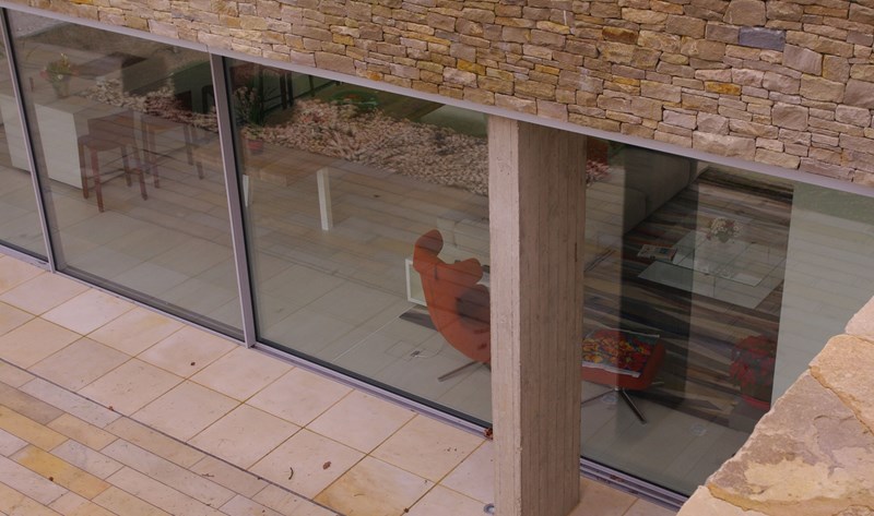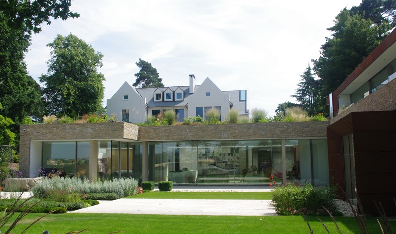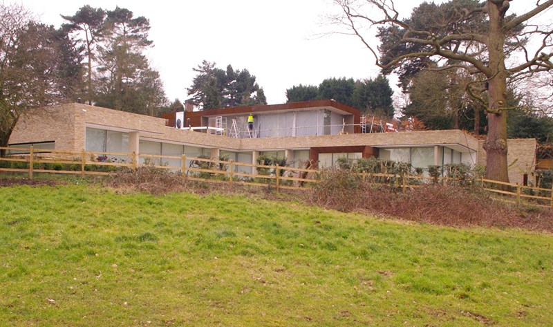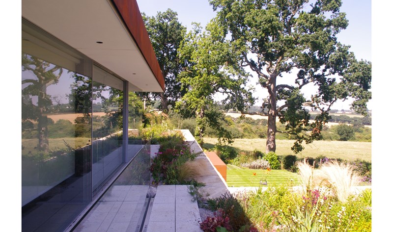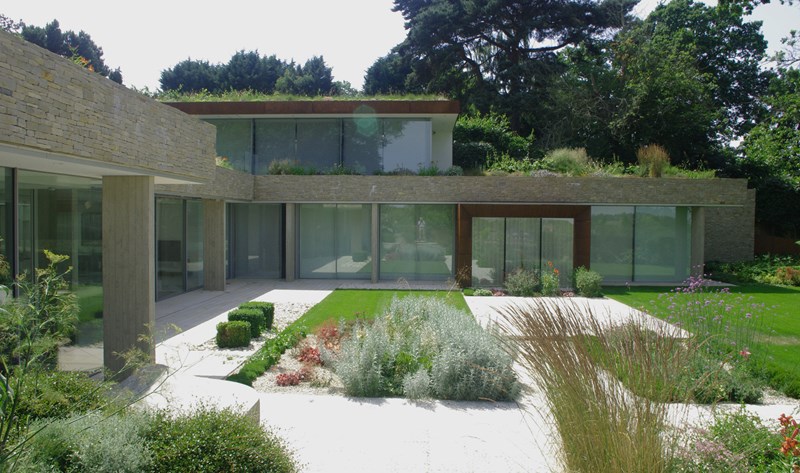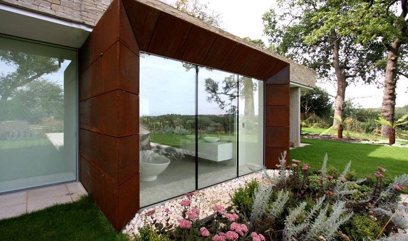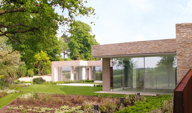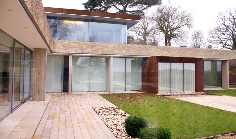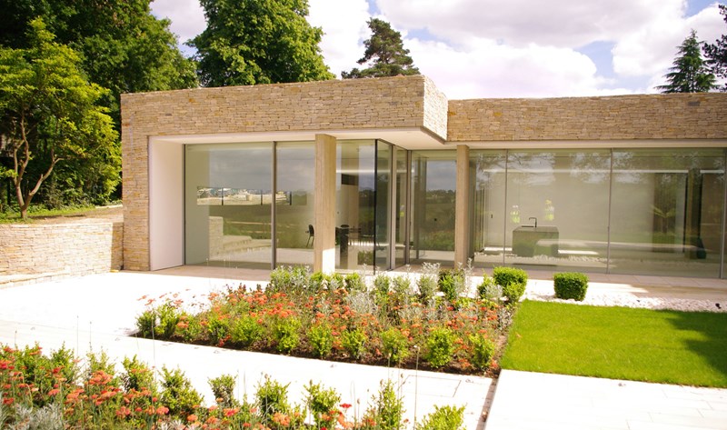 Externally, luxurious natural materials satisfy the contemporary desire for richness. Walls are faced in random Cotswold dry stone walling, with features in corten oxidised steel and fumed oak. An extensive 3m high sliding glass wall is continuous across all principal rooms, facing the views over open Crown Estate countryside beyond. The effect is that the house interior and garden are as one, fully integrated with the natural landscape. Internally, the minimalist concept is tempered with the contrasting textures of stone and wood flooring, natural board-marked concrete, sleek glass kitchen units, quirky pendant lights and built-in storage units with integrated LED lighting. Warm colours are introduced with contemporary Italian furniture.