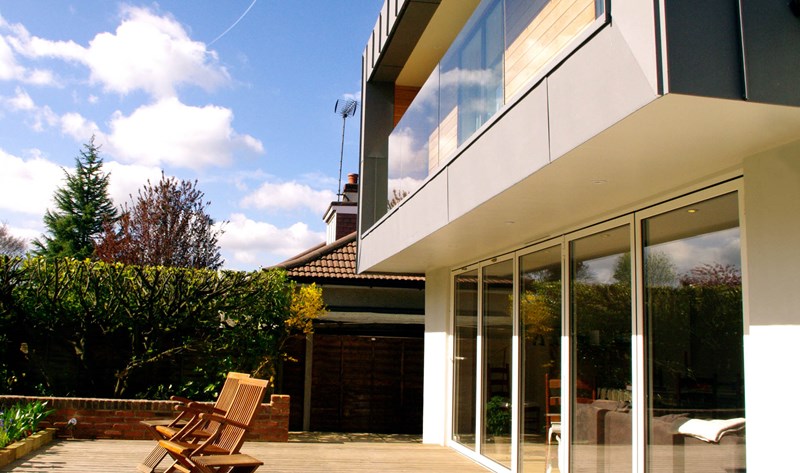 On the first floor two new bedrooms and bathrooms were created with a full length glass fronted balcony overlooking the attractive garden. On the ground floor a spacious kitchen / dining / living room replaced a detached single garage, with full length, full height fold-aside doors opening onto a new south facing deck and the garden.