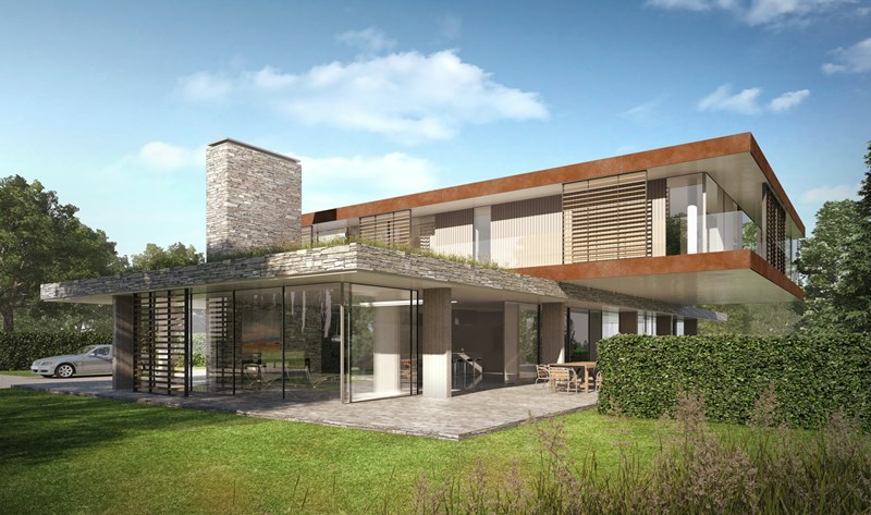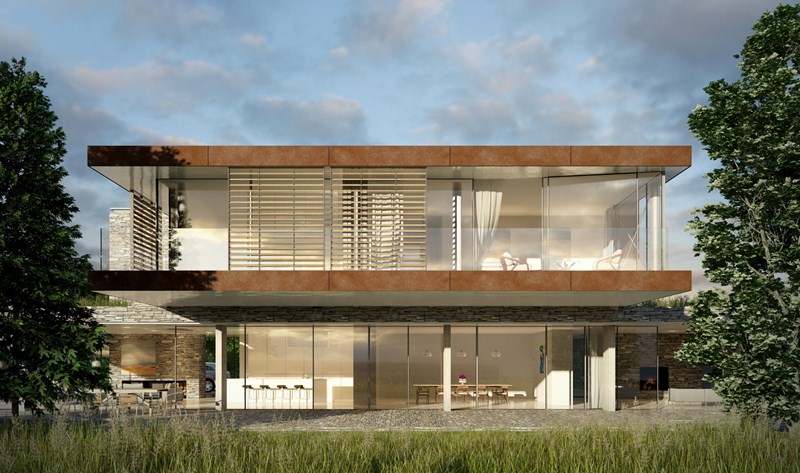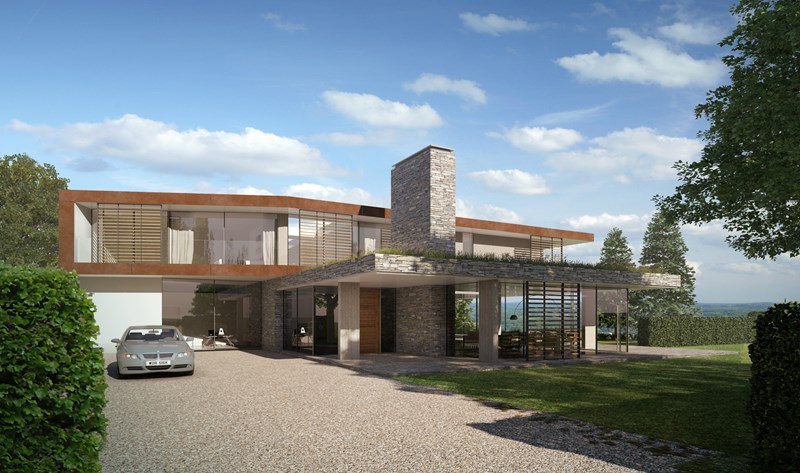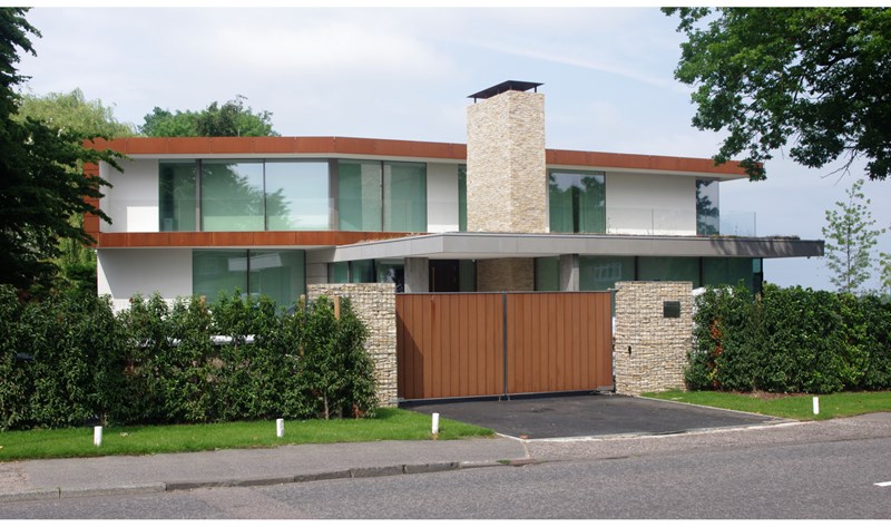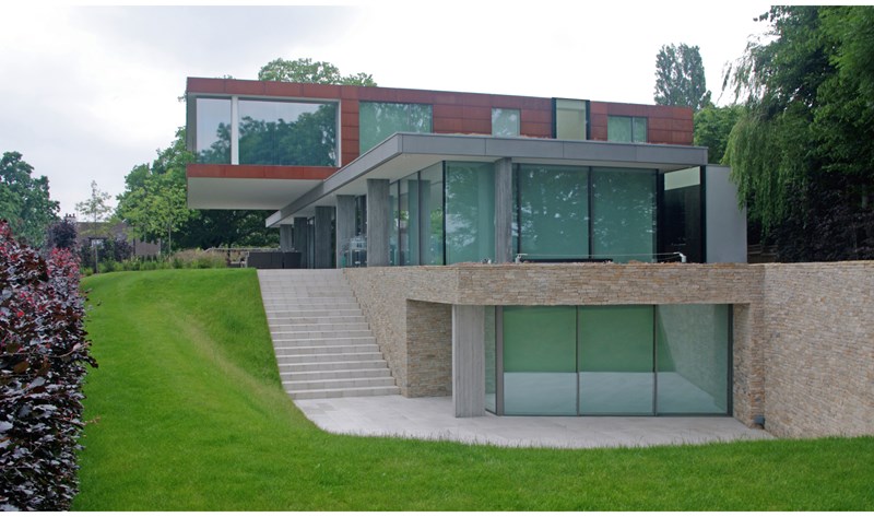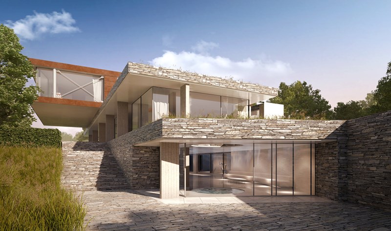 An uncompromisingly modern re-development on the edge of open countryside. By a clever design, which captured the Town Planner's enthusiasm, we achieved permission where two previous applications and an appeal by others had failed, and for a much larger dwelling. Externally, luxurious natural materials satisfy the desire for richness, in a contemporary interpretation. Walls are faced in random dry stone cladding, with features in corten oxidised steel, exposed concrete and fumed oak. An extensive sliding glass wall is continuous across all principle ground floor rooms, all facing the views over the open countryside. The two storey entrance hall with glass bridge and glass floors brings natural light down through the interior to the basement pool, spa and leisure area, which opens to a sunken courtyard.